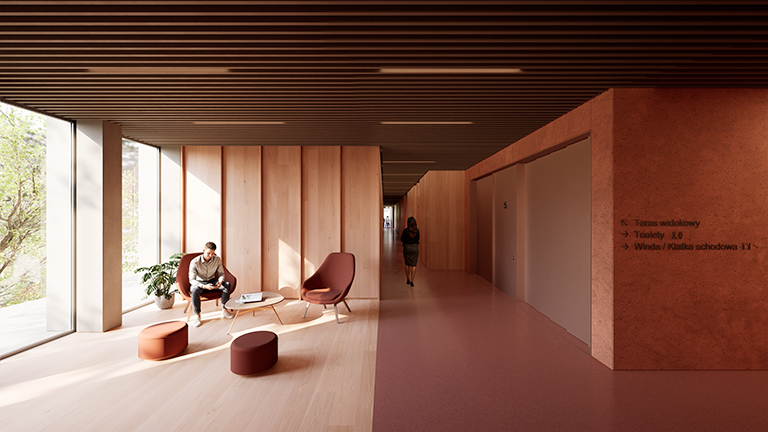 At the heart of the building, a bright, top-lit atrium links all levels and programmes. Its expression is warm, simple, and materially rooted in Wrocław’s brick-built heritage. This central space becomes a place for exchange, reinforcing the HTSH’s collaborative spirit.